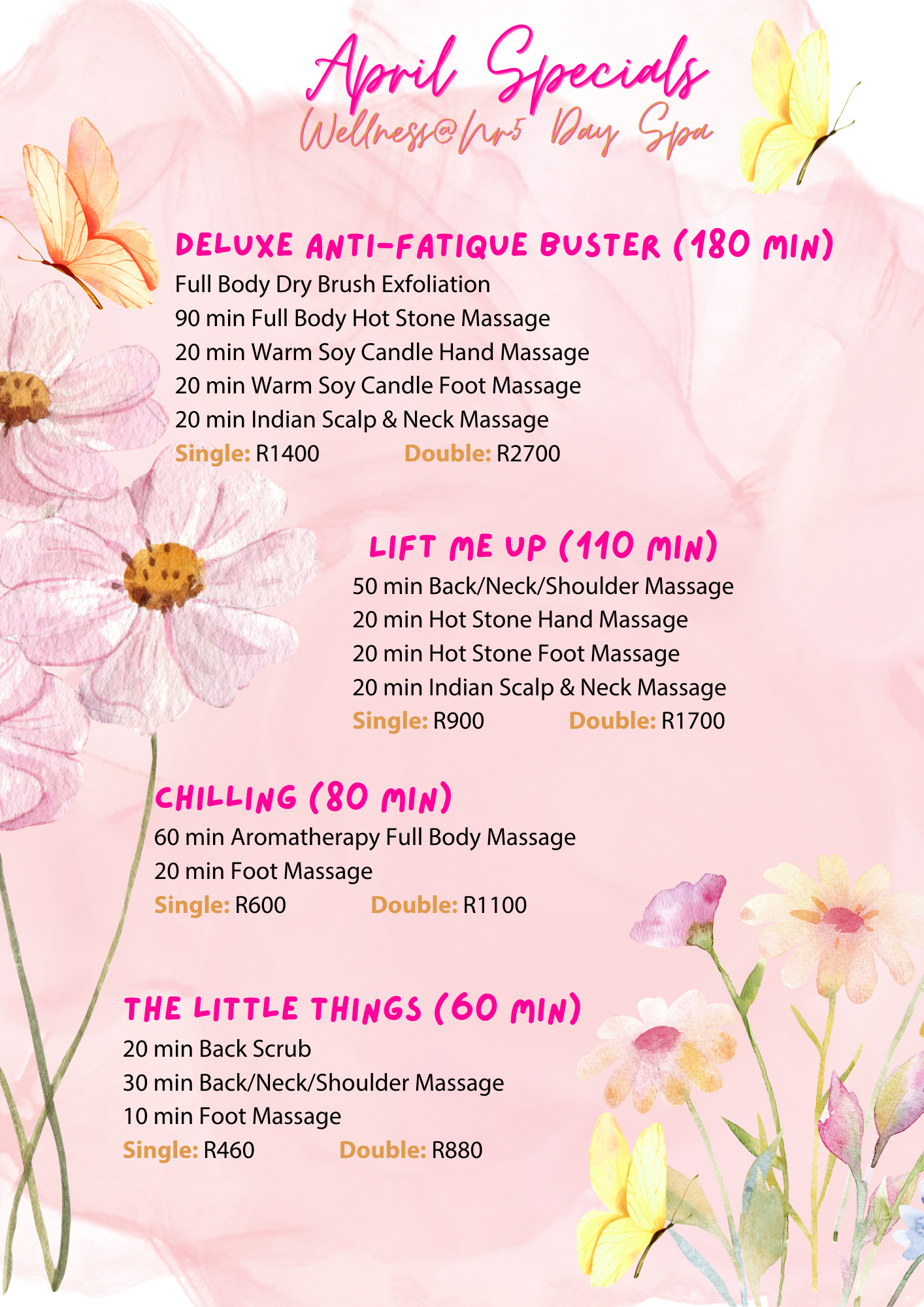 The menu includes Swedish, Hot Stone, Bamboo, Aromatherapy, Hot Candle and Indian Head Massage. The choice is yours!